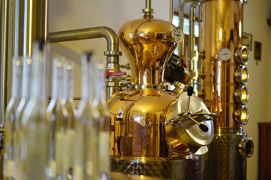 Der Kleinbetrieb ermöglicht langsames, kontinuierliches Brennen. Die Rohstoffe aus dem eigenen Obstgarten wurden in der Kleinbrennerei behutsam von Hand verarbeitet.